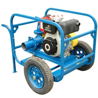 Мотопомпа состоит из центробежного насоса 6, двигателя 2, газоструйного аппарата 1 и рамы 5. Корпус насоса крепится к фланцу дизеля через кронштейн, в корпусе насоса выполнен спиральный отвод. Рабочее колесо – одностороннего входа, открытого типа. Подвод жидкости к рабочему колесу осевой. Входной патрубок выполнен в корпусе насоса на оси вращения (горизонтально). Напорный патрубок – боковой выполнен в корпусе в одной плоскости с осью вращения и развернут вертикально. Рабочее колесо крепится на удлинителе, который в свою очередь крепится на выходном конце вала двигателя. Для заполнения насоса водой предусмотрен газоструйный аппарат который работает от выхлопных газов двигателя.